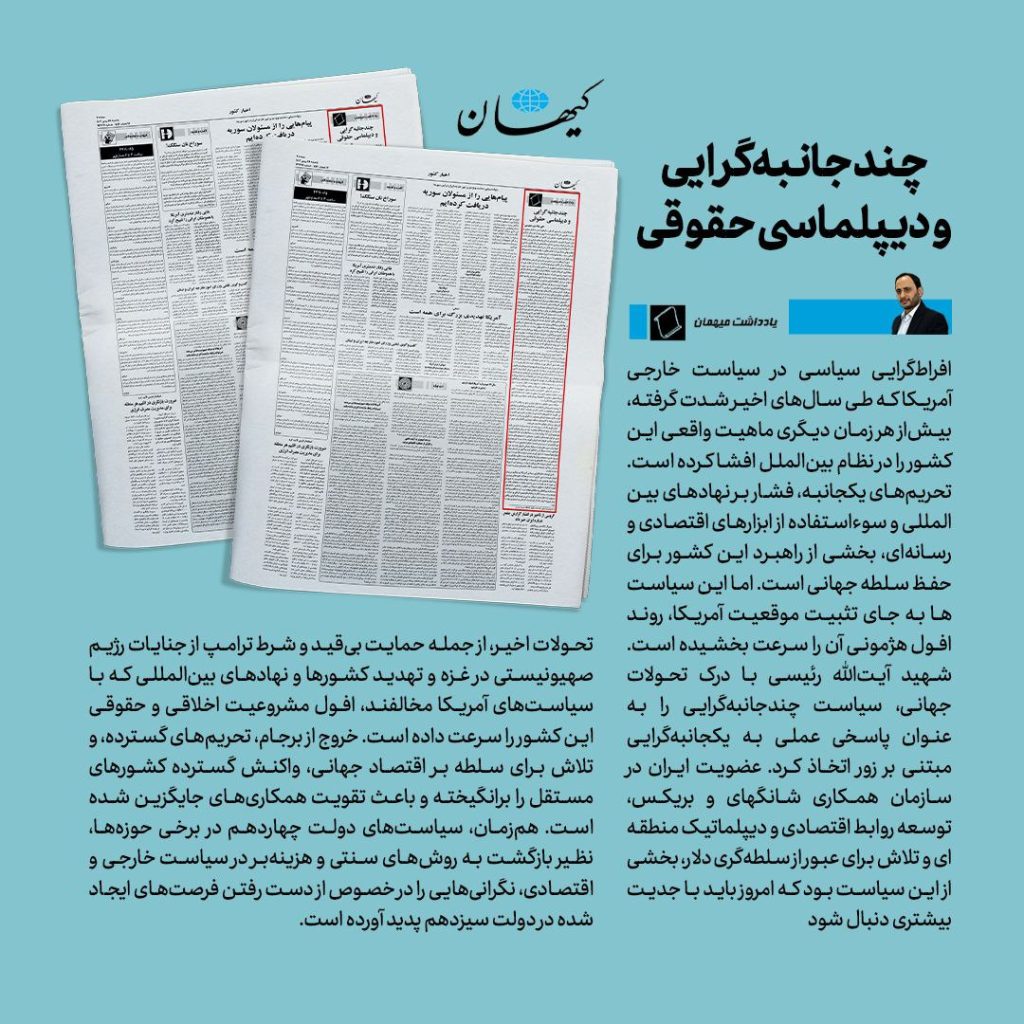 با این اوصاف، افراطگرایی سیاسی آمریکا تیر دیگری بر پیکر اعتبار نحیفشده این کشور است و همانند تجربههای پیشین، روند افول هژمونی غرب را شتاب خواهد بخشید. راه عبور از این دوره، نه در عقبنشینی یا حتی مقاومت منفعلانه، بلکه در تقویت ابتکارات حقوقی، دیپلماسی متوازن و تحکیم ساختارهای چندجانبه بینالمللی و منطقهای نهفته است. آینده نظام بینالملل بهوضوح به سمت گذار از یکجانبهگرایی افراطی و حرکت به سوی یک نظم جدید جهانی مبتنی بر چندجانبهگرایی واقعی پیش میرود؛ ایران باید از این فرصت تاریخی بیشترین بهره را