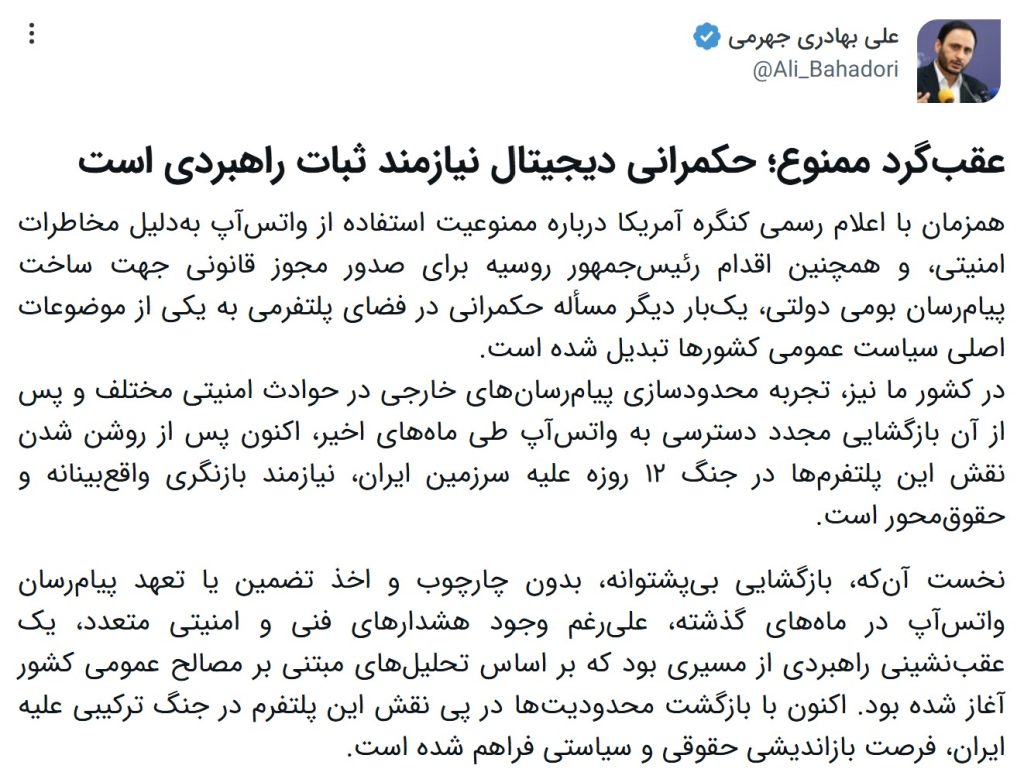 همزمان با اعلام رسمی کنگره آمریکا درباره ممنوعیت استفاده از واتسآپ بهدلیل مخاطرات امنیتی، و همچنین اقدام رئیسجمهور روسیه برای صدور مجوز قانونی جهت ساخت پیامرسان بومی دولتی، یکبار دیگر مسأله حکمرانی در فضای پلتفرمی به یکی از موضوعات اصلی سیاست عمومی کشورها تبدیل شده است. در کشور ما نیز، تجربه محدودسازی پیامرسانهای خارجی در […]