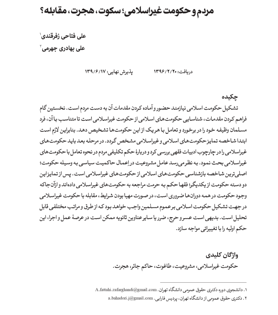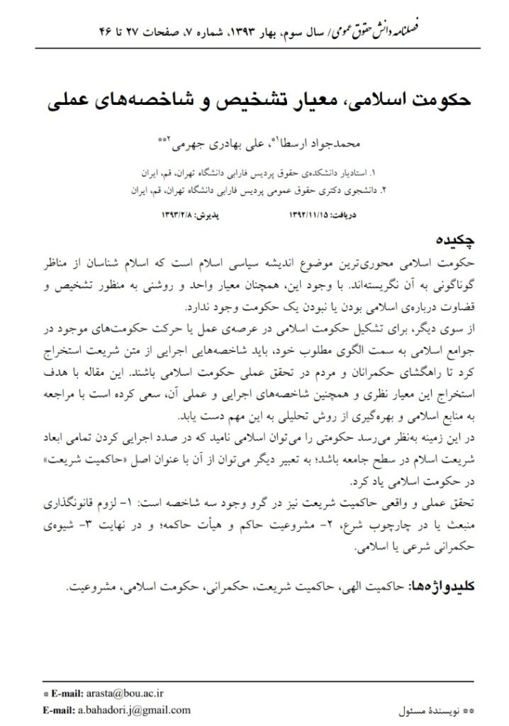 نویسندگان: علی بهادری جهرمی، محمدجواد ارسطا . چکیده حکومت اسلامی محوری ترین موضوع اندیشه سیاسی اسلام است که اسلام شناسان از مناظر گوناگونی به آن نگریسته اند. با وجود این، همچنان معیار واحد و روشنی به منظور تشخیص و قضاوت درباره ی اسلامی بودن یا نبودن یک حکومت وجود ندارد. از سوی دیگر، برای تشکیل حکومت […]