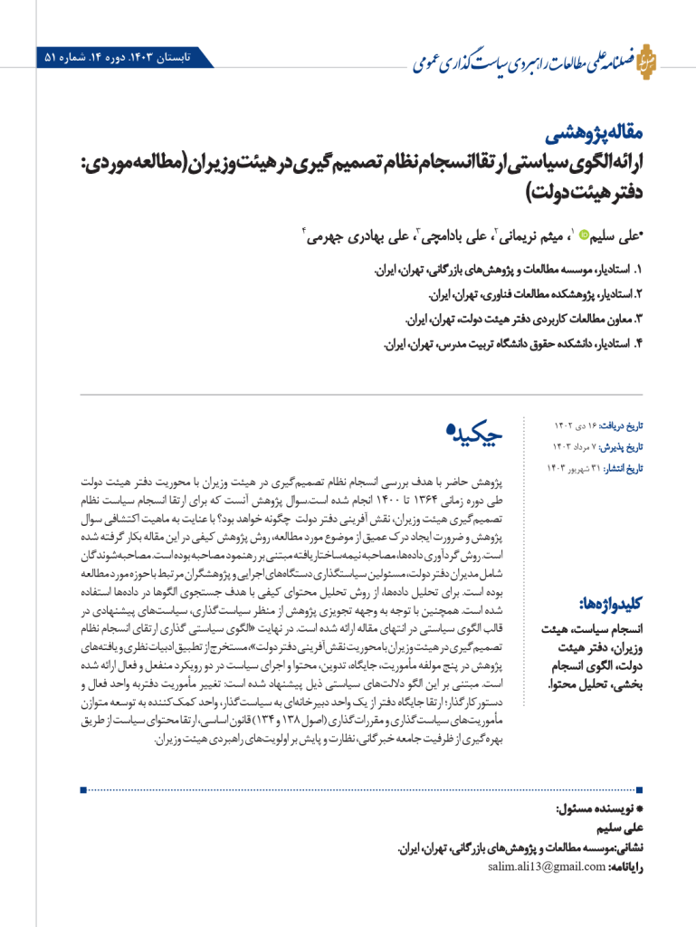ارائه الگوی سیاستی به منظور ارتقای انسجام نظام تصمیم گیری در هیات دولت مطالعه موردی:دفتر هیات دولت