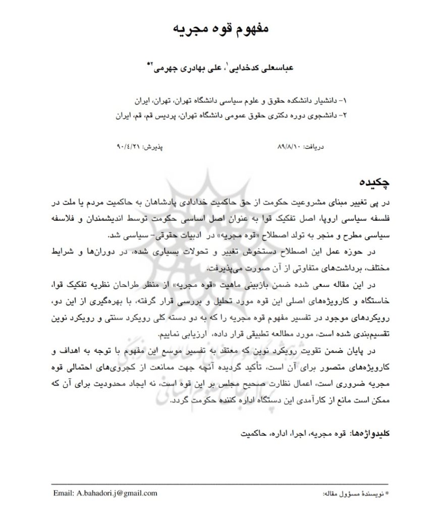 نویسندگان: علی بهادری جهرمی، عباسعلی کدخدایی. چکیده در پی تغییر مبنای مشروعیت حکومت از حق حاکمیت خدادادی پادشاهان به حاکمیت مردم یا ملت در فلسفه سیاسی اروپا، اصل تفکیک قوا به عنوان اصل اساسی حکومت توسط اندیشمندان و فلاسفه سیاسی مطرح و منجر به تولد اصطلاح «قوه مجریه» در ادبیات حقوقی- سیاسی شد. در حوزه عمل این […]