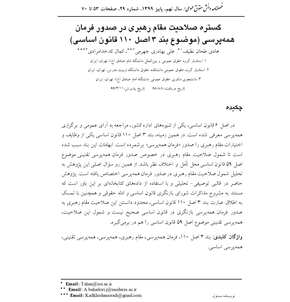 گستره صلاحیت مقام رهبری در صدور فرمان همه پرسی(موضوع بند ۳ اصل ۱۱۰ قانون اساسی)