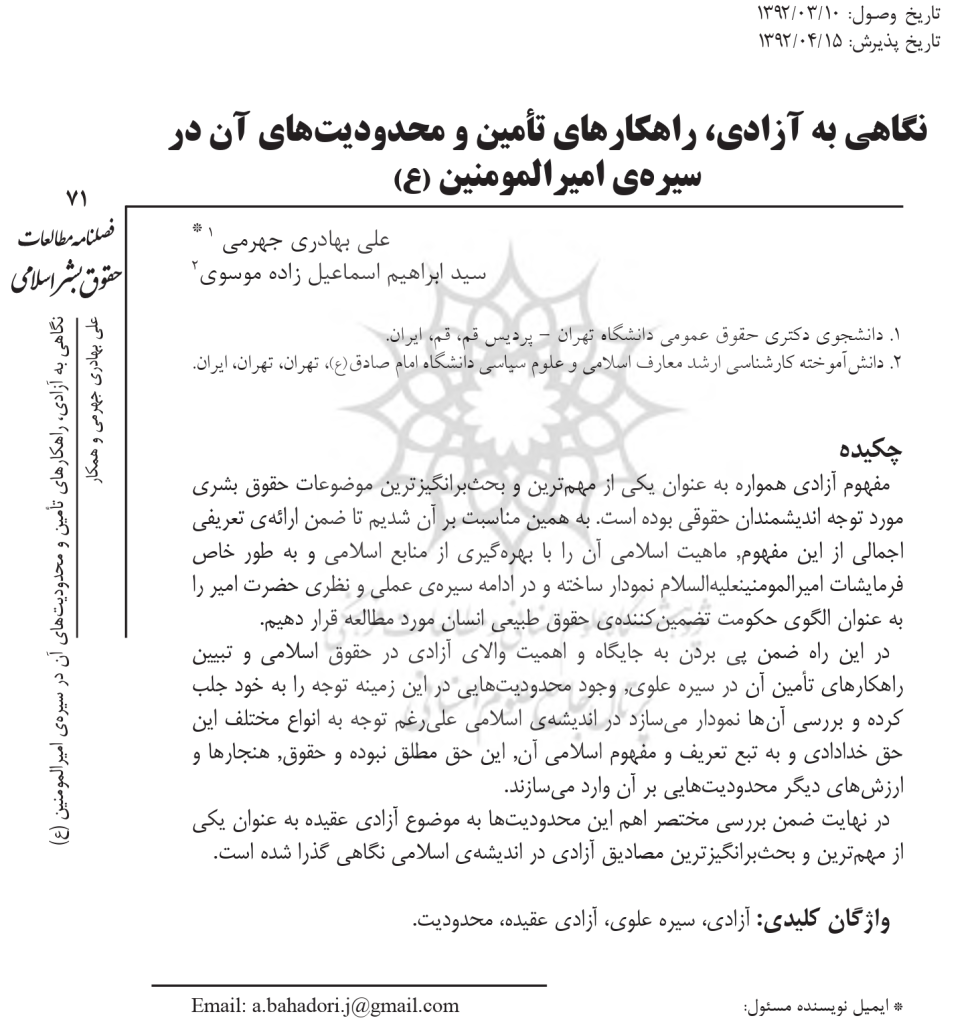 نگاهی به آزادی، راهکارهای تامین و محدودیت های آن در سیره امیر المومنین (ع)