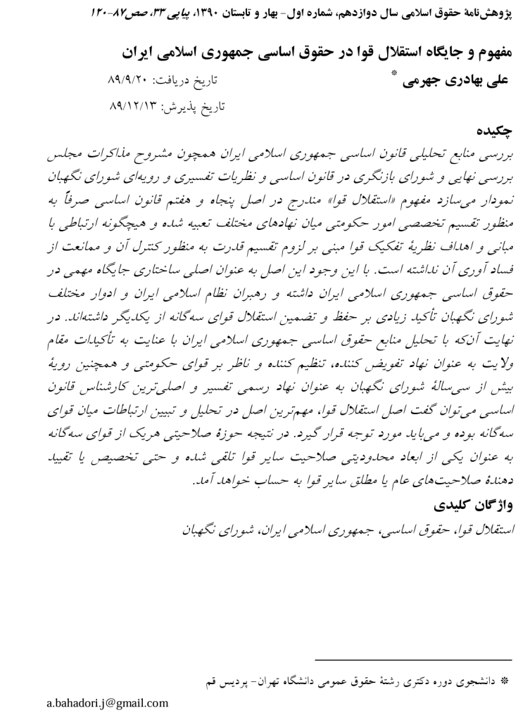 مفهوم و جایگاه استقلال قوا در حقوق اساسی جمهوری اسلامی ایران