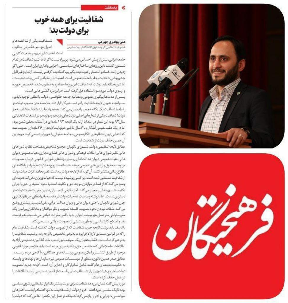 یادداشت || روزنامه فرهیختگان||۱۴۰۰/۰۴/۰۳ علی بهادری جهرمی، حقوقدان عضو هیئت علمی گروه حقوق دانشگاه تربیت مدرس؛ شفافیت برای دولت بیشتر یک ابزار تبلیغاتی و شوی سیاسی بوده تا یک مشی مورد اعتنا: خروج دولت از شفافیت، نهتنها اعتماد را به ساختارهای سیاسی، اجرایی و اداری بازنمیگرداند، بلکه در عمل این نکته را القا میکند که […]